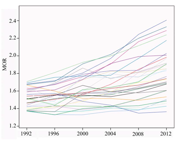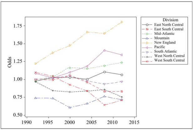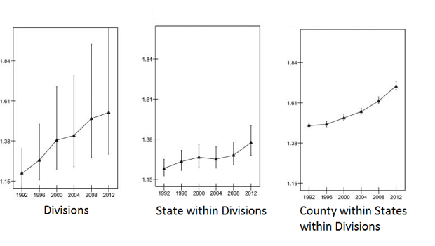 The study then borrows from research on geographic segregation to create a broader measure it dubs a “median odds ratio” of political polarization for each of these three levels. As the graphs above show, these odds ratios also consistently increase over the two decades between 1992 and 2012. Indeed, the study finds that polarization increased by 29 percent across Census regions, 12 percent across states, and 14 percent across counties over this period.