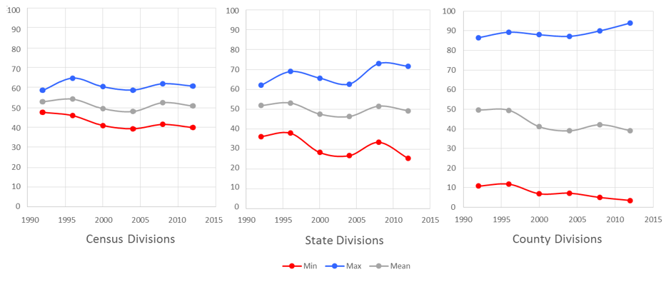 The chart above shows the distribution of votes for these divisions, states, and counties using the minimum, maximum, and average percentage of Democratic votes that each geographic level garnered. The takeaway is that there’s substantial evidence of a growing spatial polarization across all three. Aside from a blip in 1996, there’s been a general decline in the minimum number of Democratic voters and an increase in the maximum number of Democratic voters at each scale.