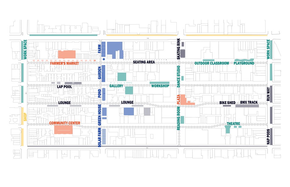 Within this basic configuration, mini-grids comprising 10 to 15 blocks would function as small neighborhoods of relatively quiet, safe streets, surrounded on four sides by bustling thoroughfares.
