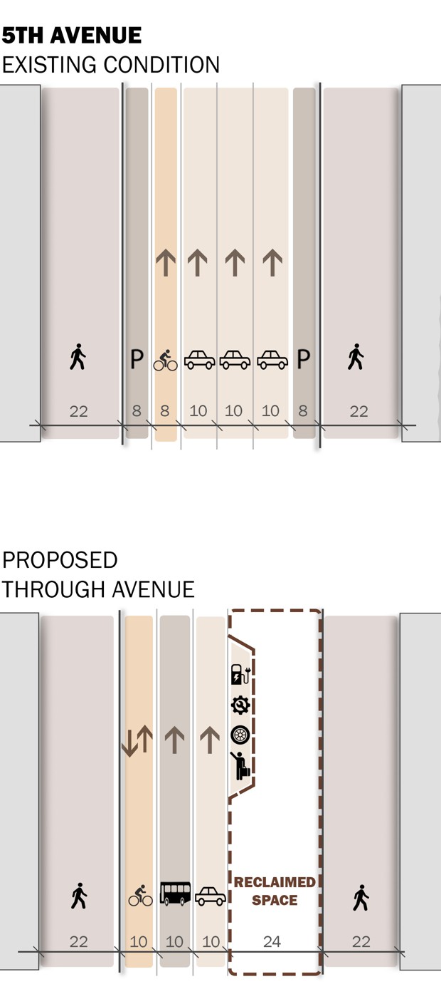 All the elements combined—dedicated car and bus lanes, bicycle lanes, and pedestrian-friendly spaces—take up less space compared to existing layouts. Avenues would reclaim 24 feet; wider streets, 16 feet; and narrow streets, 8 feet. In the reclaimed space, new amenities could be provided, such as pop-up shops, food and beverage venues, or flexible work spaces. Reclaimed street space could also host charging stations, deliveries, or taxi and ride-share pick-ups and drop-offs.