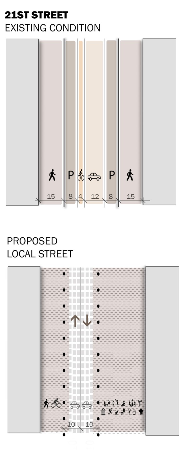 Local streets would undergo more drastic transformations. They would be curbless; car lanes would be raised a few inches to the level of the original curb, for a level surface (sloped only as needed for drainage). Vehicles and pedestrians would share the space, similar to a woonerf.