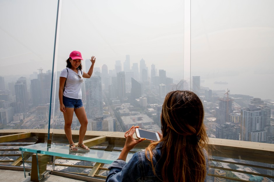 Tourists taking the golden elevators to the top of the iconic Space Needle found the rotating viewing deck, but not the trademark views of the Olympic Mountains or Mt. Rainier. Even the south end of Seattle’s downtown was shrouded in murk.