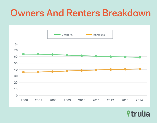 As the chart above shows, the share of U.S. households that rent increased from 36.1 percent in 2006 to 41.1 percent in 2014. Meanwhile, the share of households who own their own homes declined over that same period. The share of renters increased in each and every one of the 50 U.S. metros Trulia examined.