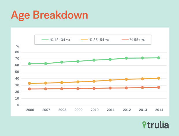 But renting was up among all age groups, as the chart above shows. The share of renters increased from 33 to 40.7 percent among households ages 35-54. Trulia speculates that this group may have been hard hit by job loss and foreclosure during the crisis. Renting also increased, from 24.4 to 27 percent, among Americans aged 55 and older.