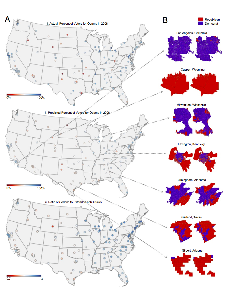 More surprising, even to the researchers themselves, is the accuracy with which the proportion of pickup trucks to sedans in a precinct—an area of about 1,000 residents—determines whether residents there lean Democratic or Republican. In Gilbert, Arizona, the model correctly identified the voting patterns of 58 out of 60 precincts—a 97 percent accuracy rate. Overall the model indicated that a city with more sedans has an 88 percent chance of voting for a Democrat in the next election, and those with with more pickup trucks are 82 percent more likely to vote Republican.